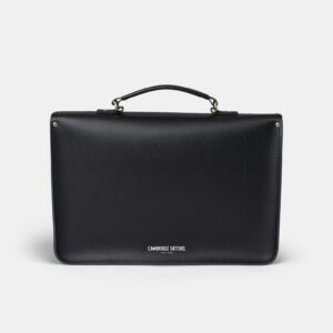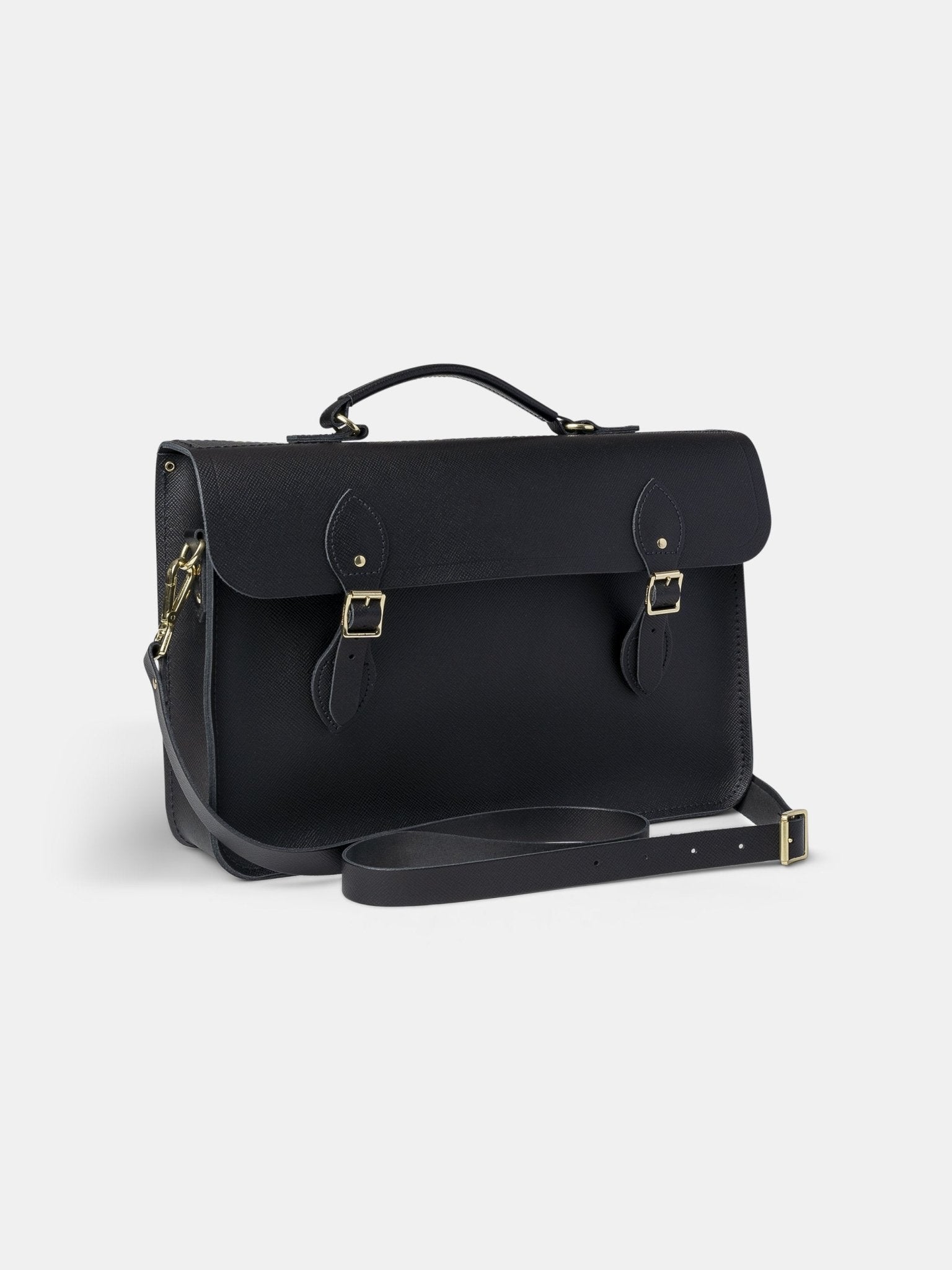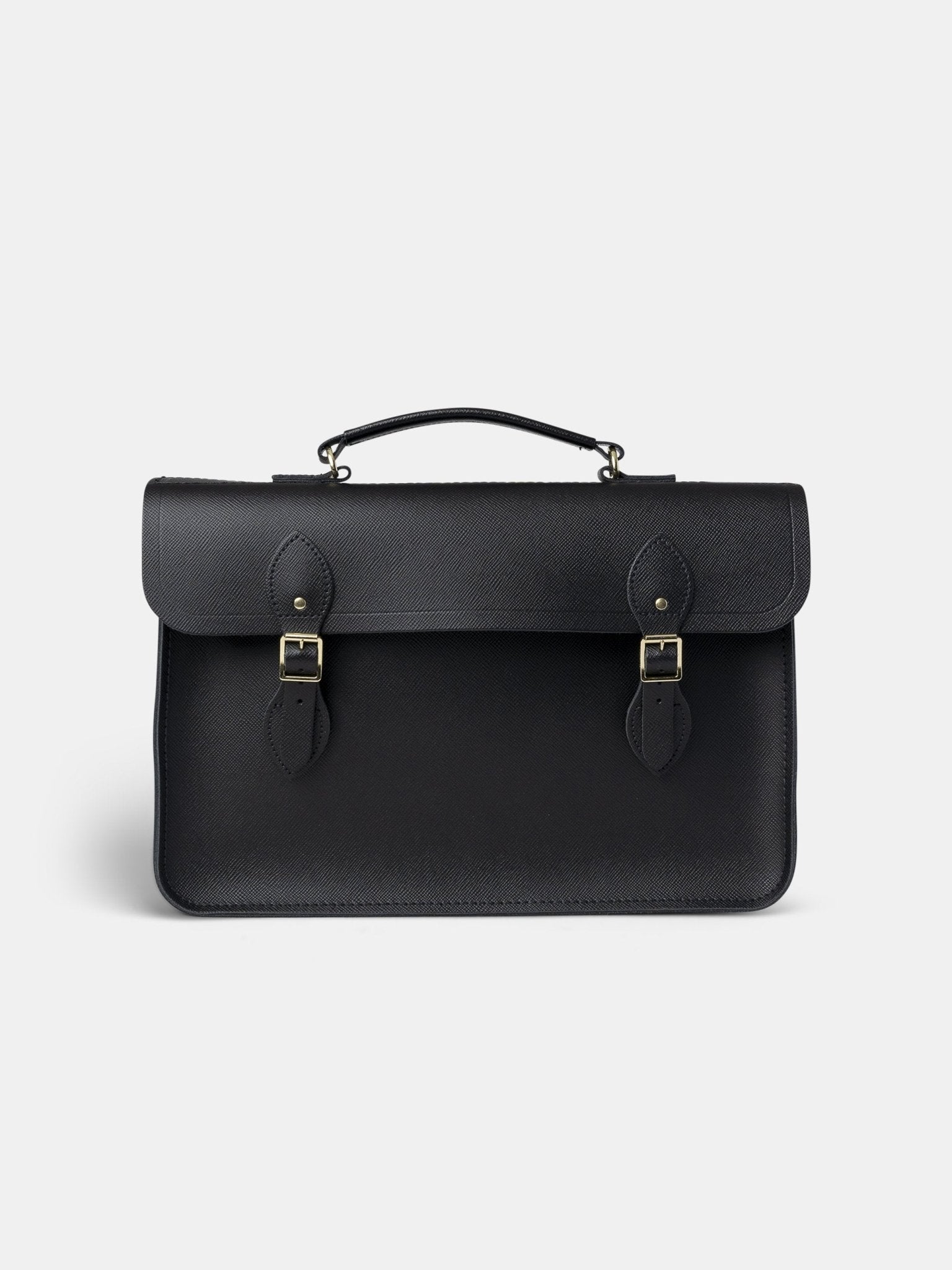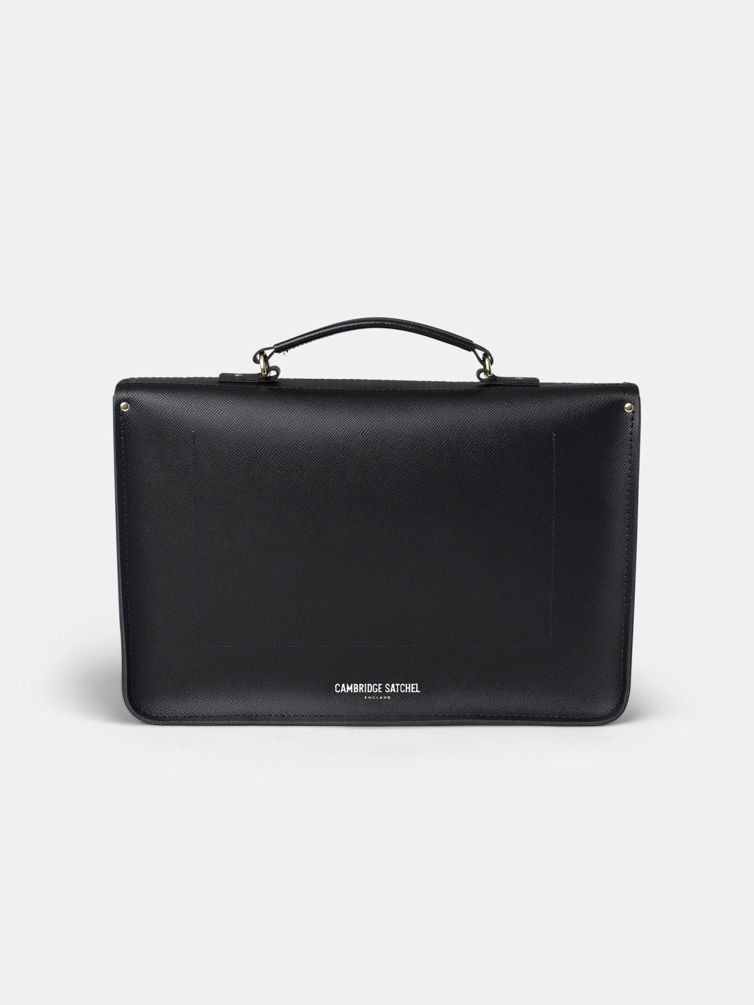 The ultimate in sophistication – black Saffiano leather, durable yet so elegant with its distinctive cross hatch texture. The classic bag for work, The Briefcase has a long history with the legal profession. It is still common to see Barristers in wig and gown rushing between their Chambers and court carrying a similar case stuffed with legal papers. Our version of The Briefcase offers plenty of space for several folders and a handy interior pocket to keep your papers in order in the court. Suitable for legal briefs or creative briefs, this handsome bag is a perfectly judged investment in your career.