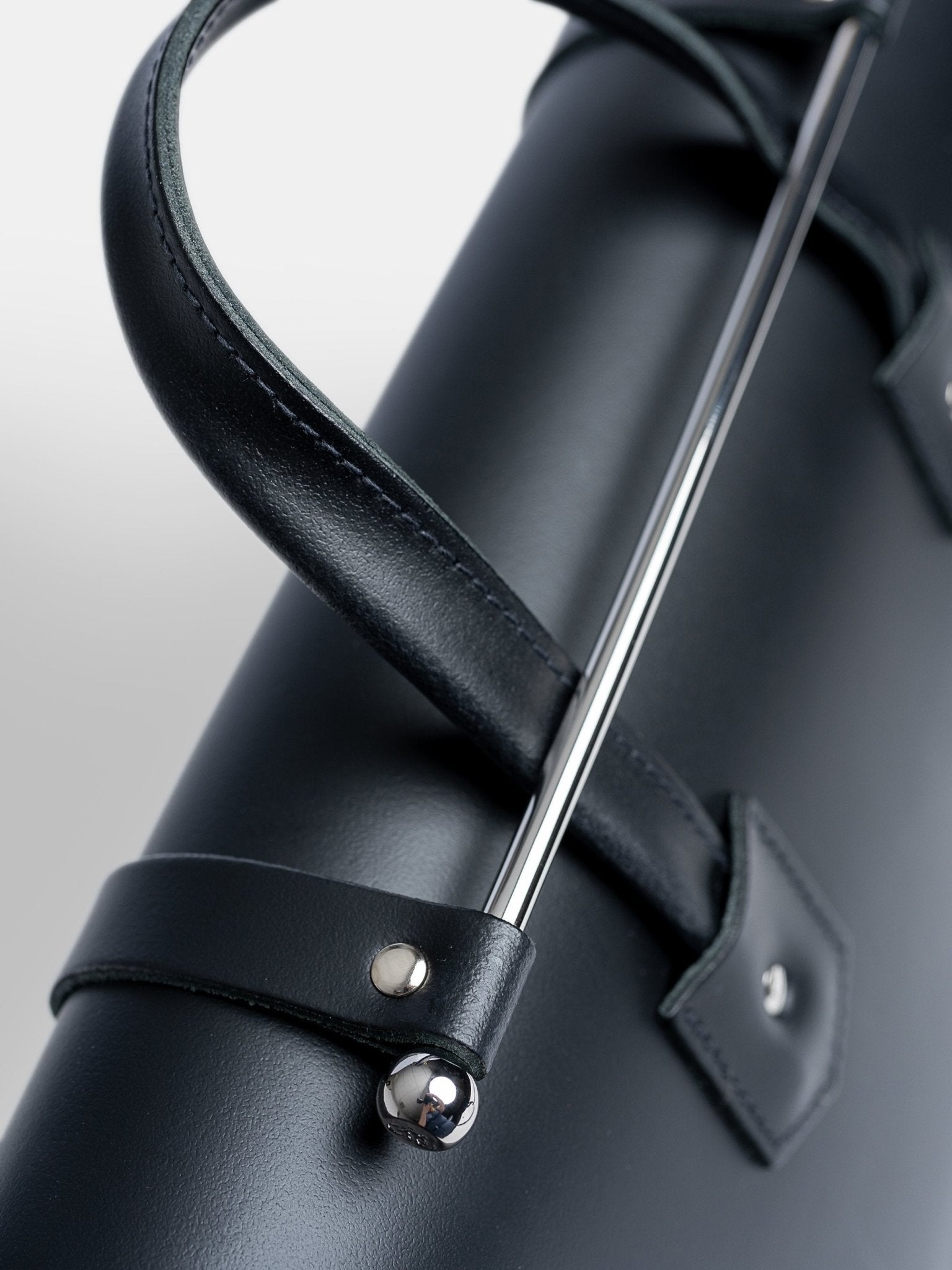 – Distinctive top handle with signature steel bar closure